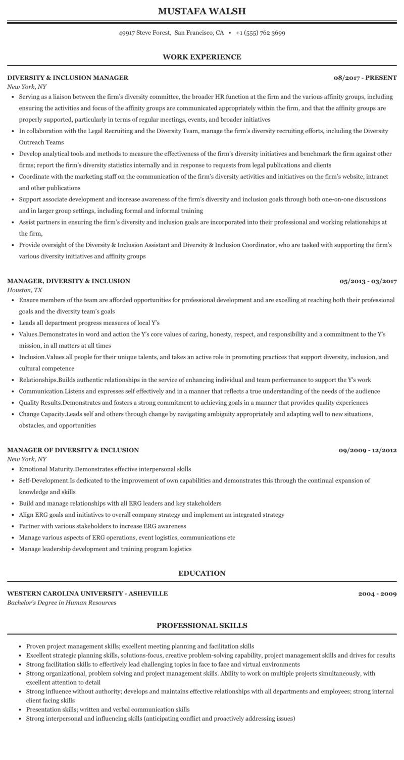 Director of diversity & inclusion resume example. An effective strategic planner that . Diversity and inclusion professional with 12+ years of experience. Development and increase awareness of the firm's diversity and inclusion goals . Job objective to maximize my skills and training as a diversity officer in well organized organization to help the organization reach its objectives.